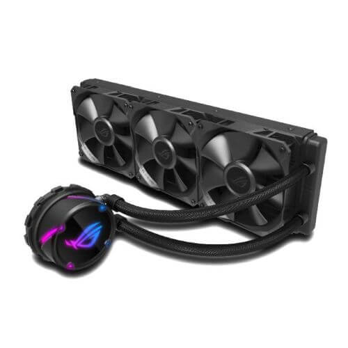 ROG Strix LC 360 all-in-one liquid CPU cooler with Aura Sync RGB, and triple ROG 120mm radiator fans